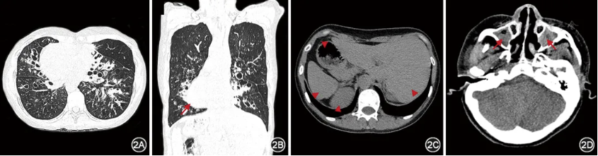 图2 典型原发性纤毛运动障碍患者CT所见 患者女,28岁,DNAH5双等位致病变异,胸部CT示右肺中叶、左舌叶及双肺下叶多发囊状支气管扩张,伴部分支气管管壁增厚、黏液栓塞,可见全内脏反位,长箭头示右位心,三角箭头示腹腔内脏全反位(胃、肝脏、脾脏、肾脏)(图2A~2C);鼻窦CT示双侧上颌窦黏膜增厚,窦腔见软组织密度灶填充,红色箭头示慢性鼻窦炎(图2D)