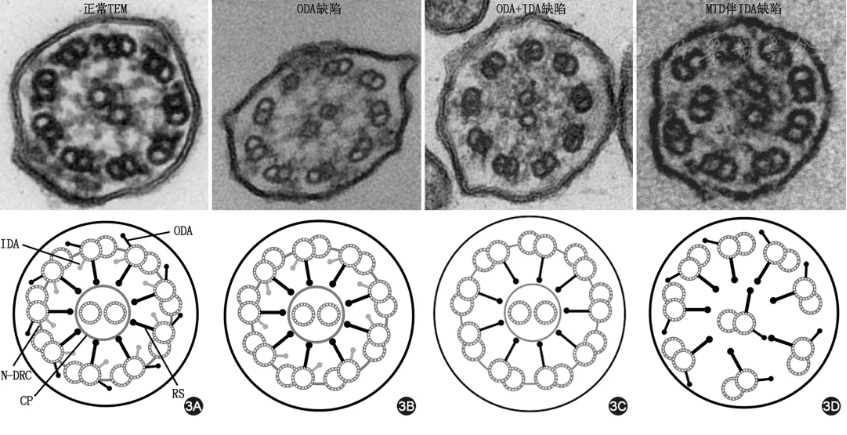 注:TEM为透射电子显微镜;ODA为外动力蛋白臂;IDA为内动力蛋白臂;CP为中央微管对;RS为辐射轴;N-DRC为连接蛋白-动力蛋白调控复合物;MTD为微管组织紊乱