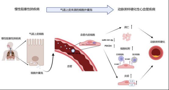 本研究从“气道上皮—血管内皮”跨器官通讯角度,系统阐明了慢阻肺气道上皮细胞来源EVs通过miR-141-3p/PDCD4轴促进动脉粥样硬化的新机制,揭示了慢阻肺与心血管疾病之间的分子桥梁(见图)。相关发现不仅加深了对慢阻肺共病机制的认识,也为研发新的干预策略提供了理论依据。
