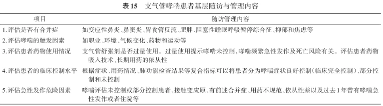 对于已经纳入慢性病综合管理的哮喘患者,应定期随访及评估,起始治疗阶段建议每2~4周复诊评估病情,进入稳定期后可调整为每1~3个月随访1次。每次复诊时除评估患者控制情况,还需核查患者吸入技术掌握情况及依从性,并针对性强化指导(具体随访内容见表15),同时强调患者及家属参与完成哮喘控制分级评估及症状评估(表5、6),并描述日常症状记录,根据症状记录判断哮喘控制水平,进行治疗方案升降阶梯调整。