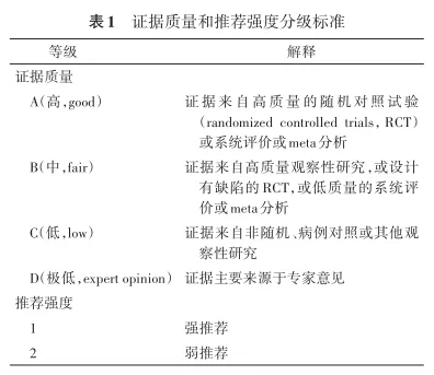 本指南修订初期,指南工作组围绕基层哮喘临床实践中的关键问题,对281名基层医务人员开展问卷调查,共收集临床问题843条,经合并后遴选出50条迫切需要解决的问题,汇总专家意见后进一步凝练为36个临床问题,编写组专家最终审议并确定为24个临床问题,用于形成推荐意见。推荐意见的制订过程如下:针对每个具体临床问题,由呼吸病学专业的医生在PubMed、Cochrane Library、Embase、Web of Science、中国知网及万方数据知识服务平台进行文献检索,检索日期从建库至2025年5月31日,根据预先制订的纳入和排除标准进行文献筛选,再根据统一的文献评价表格进行初评,最后由指南工作组集中逐篇复评。本指南主要采用的证据质量分级标准是GRADE(grading of recommendations assessment,development and evaluation)方法(表1)。证据质量分为“高、中、低、极低”4个等级,分别用A、B、C、D表示;推荐意见分为“强推荐、弱推荐”两个级别,分别用1和2表示。见表1。