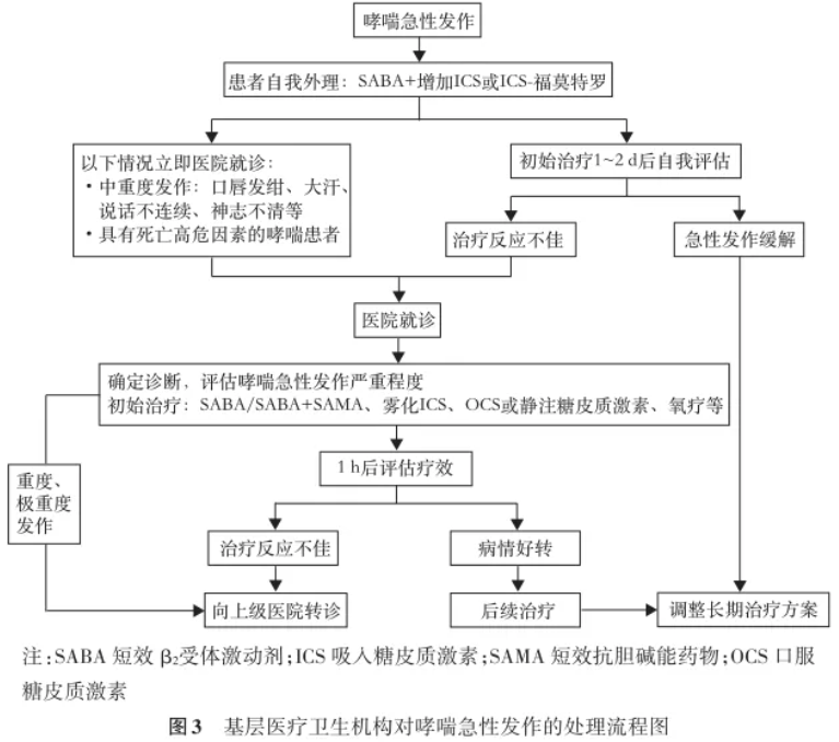 当患者出现中重度急性加重,经紧急处理后症状无明显缓解,应考虑紧急转诊至上级医院。转诊前需吸氧、开放静脉通路、持续心电监测、给予雾化激素和支气管舒张剂治疗,必要时使用全身性糖皮质激素,并提前联系转诊医疗机构,沟通患者病情。