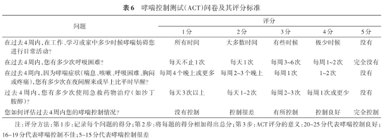 1. 症状评估:症状评估可通过哮喘控制测试(asthma control test,ACT)问卷完成。ACT是评估既往1个月哮喘患者控制水平的问卷,ACT得分与专家评估的患者哮喘控制水平具有良好的相关性。具体评分标准及方法见表6。ACT简便、易操作,适合在基层医疗卫生机构使用[49]