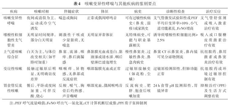CVA需与嗜酸性粒细胞性支气管炎、上气道咳嗽综合征、变应性咳嗽和胃食管反流性咳嗽等鉴别,鉴别要点见表4。CTVA需与心脏疾病、焦虑症、胃食管反流病、肺栓塞等鉴别[4]