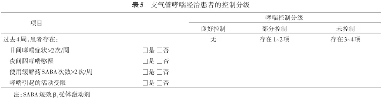 1. 哮喘临床控制水平评估[23]:哮喘控制分级可分为良好控制、部分控制和未控制3个等级(表5),据此来确定治疗方案和调整用药。同时也应注意如咳嗽、胸闷等不典型症状,以及症状的持续时间、诱发加重或缓解的因素等。