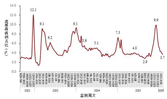 2026年第1周(2025年12月29日-2026年1月4日)至第5周(2026年1月26日-2月1日),全国哨点医院流感样病例占门(急)诊就诊人数比例呈下降趋势,分别为5.0%、4.3%、4.3%、4.0%、3.7%。见图4-1。