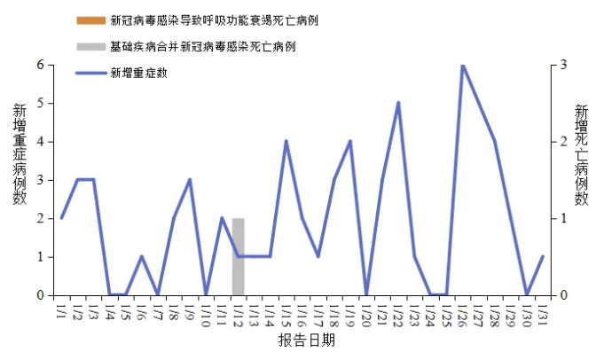 2026年1月1日-1月31日,全国31个省(自治区、直辖市)及新疆生产建设兵团报告新增确诊病例17916例,其中重症病例60例、死亡病例1例(为基础疾病合并新冠病毒感染死亡病例),报告病例数低位波动增加。见图2、图3。