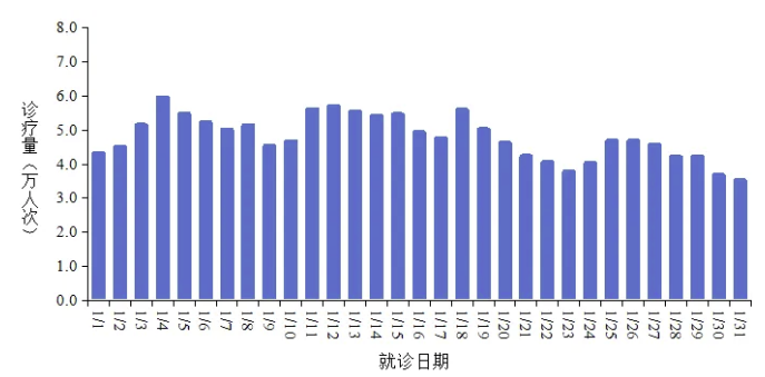 2026年1月1日-1月31日,全国31个省(自治区、直辖市)及新疆生产建设兵团各级各类医疗机构发热门诊(诊室)诊疗量,从2026年1月1日的4.3万人次上升至1月4日的5.9万人次,随后波动下降至1月31日的3.5万人次。见图1。
