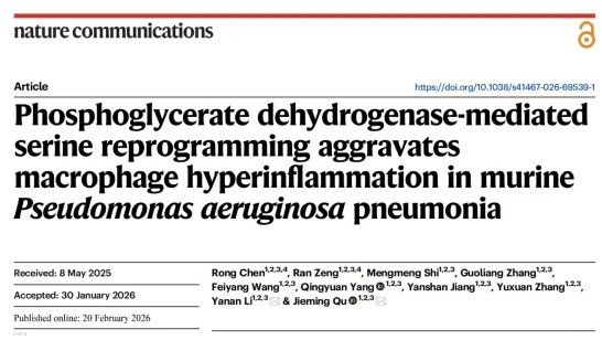 2026年2月,瞿介明教授团队在《Nature Communications》 (IF 15.7,Q1)发表题名为“Phosphoglycerate dehydrogenase-mediated serine reprogramming aggravates macrophage hyperinflammation in murine Pseudomonas aeruginosa pneumonia.”—— PHGDH介导丝氨酸代谢重编程加剧铜绿假单胞菌感染中小鼠肺部巨噬细胞过度炎症的研究论文。