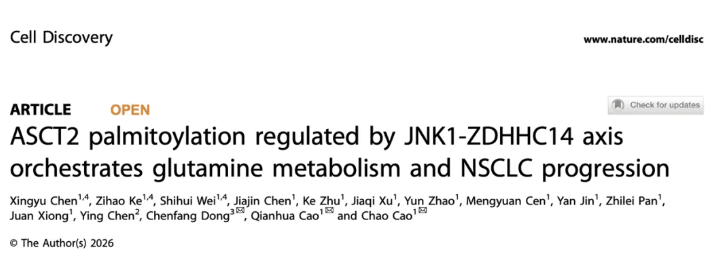 近日,宁波大学附属第一医院曹超团队在细胞生物学领域顶级期刊《细胞发现》(Cell Discovery,IF:12.5)发表了题为“ASCT2 palmitoylation regulated by JNK1-ZDHHC14 axis orchestrates glutamine metabolism and NSCLC progression”的重要研究成果。