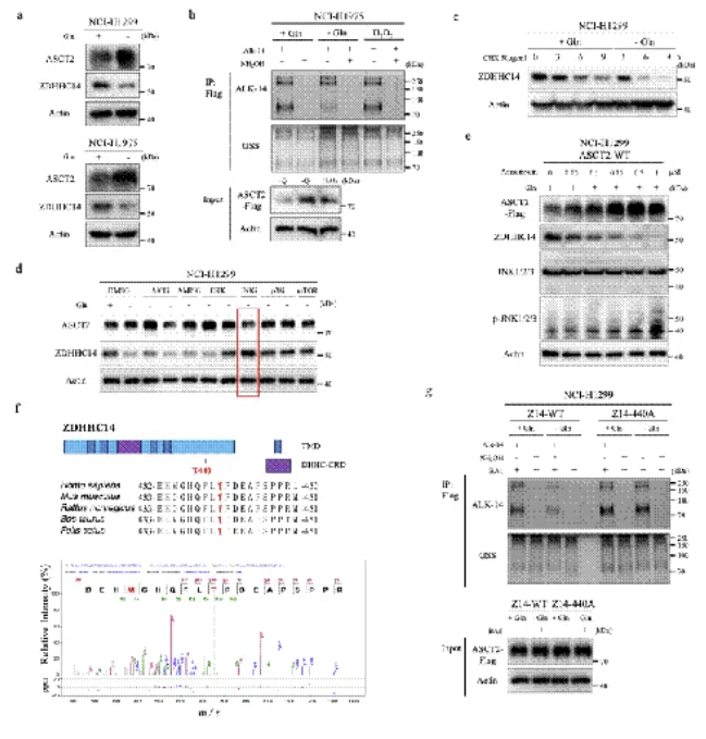 进一步机制研究表明,在谷氨酰胺缺乏条件下,应激激活的JNK1激酶可特异性磷酸化ZDHHC14的Thr440位点,促使其发生溶酶体降解,进而降低ASCT2的棕榈酰化水平,提高其蛋白稳定性。这种磷酸化依赖的ZDHHC14稳定性调控,直接将细胞代谢应激状态与ASCT2的修饰状态相耦合,构成了肿瘤细胞在微环境营养匮乏条件下维持谷氨酰胺摄取、支持持续增殖的关键适应性机制。