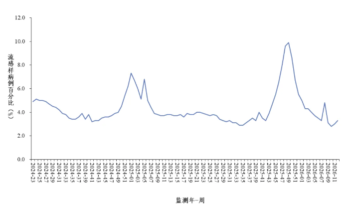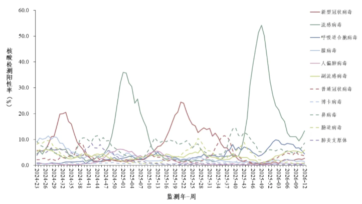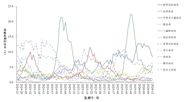 2026年第12周(2026年3月16日—3月22日),对全国哨点医院(不含港澳台)采集的门急诊流感样病例和住院严重急性呼吸道感染病例的呼吸道样本,开展新型冠状病毒、流感病毒、呼吸道合胞病毒、腺病毒、人偏肺病毒、副流感病毒、普通冠状病毒、博卡病毒、鼻病毒和肠道病毒等10种病毒以及肺炎支原体在内的多种呼吸道病原体检测。