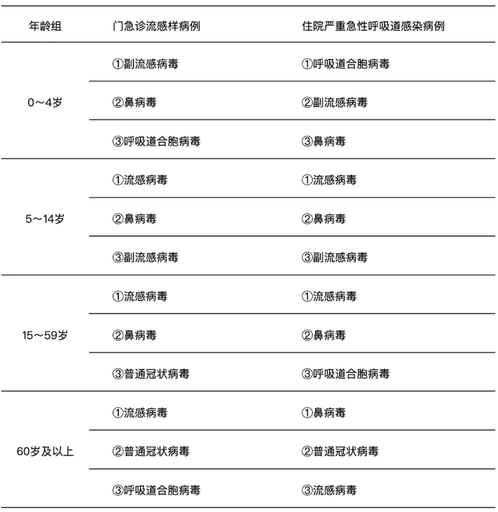 - 住院严重急性呼吸道感染病例呼吸道样本检测阳性率前三位病原体为呼吸道合胞病毒(8.4%)、鼻病毒(6.7%)、流感病毒(5.7%);