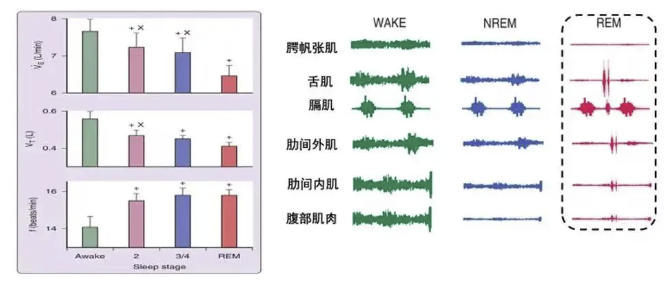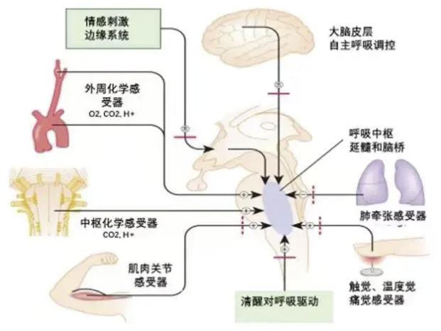 通气调控系统:在清醒状态下,通气由多重机制(包括中枢及外周化学感受器、机械感受器、行为性控制等)协同调控,代偿能力强,可维持血气相对稳定。但在睡眠(尤其卧位)时,生理状态改变导致调控能力下降: