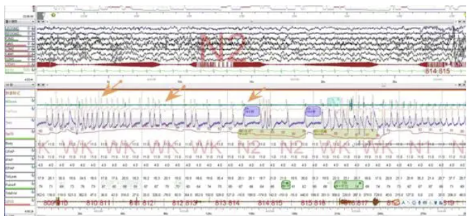 2、符合轻度阻塞性睡眠呼吸暂停低通气综合征的PSG表现AHI 7次/小时,以低通气为主。