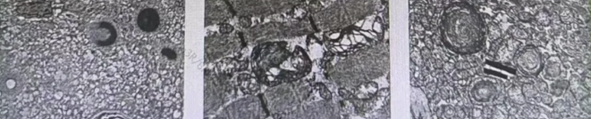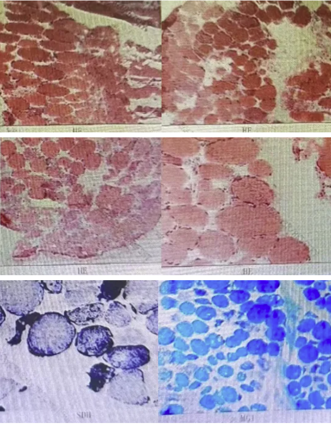 2021年于外院心血管内科:生化测定:LAC 8.08.0mmol/L↑,肌酸激酶124 U/L↑,肌酐41umol/L↓。肌肉活检:可见RRF/破损蓝纤维,电镜见晶格状线粒体等异常线粒体。