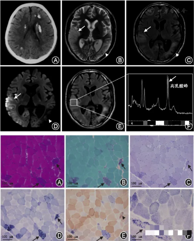 辅助检查:1.生化测定:血清肌酸激酶正常或增高,肌酸激酶/乳酸脱氢酶比例倒置,血乳酸升高;2.头颅影像学:影像学特征性改变。为非单一血管支配的病灶,具有进展性、可逆性、游走性特点;3.电生理检查:肌电图、脑电图;4.组织病理学检查:骨骼肌活检冰冻切片的典型病理改变是改良Gomori三色染色可见不整红边纤维(RRF),琥珀酸脱氢酶染色可见破碎蓝染肌纤维和(或)深染的小血管;5.基因检测:mtDNA基因突变分析是诊断该病的最敏感方法。