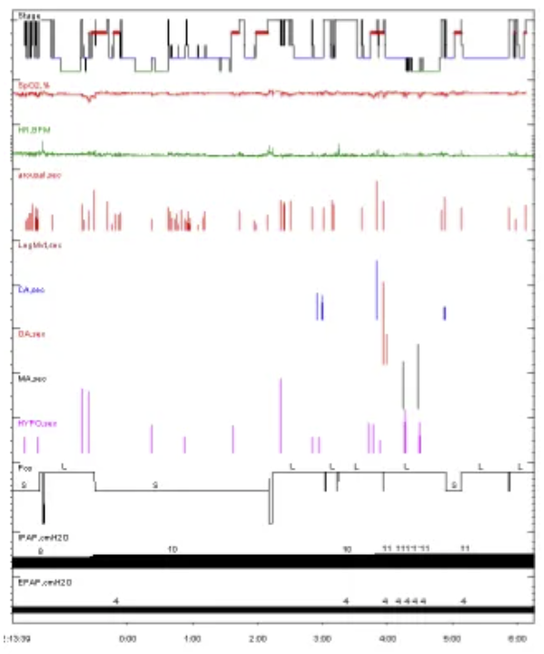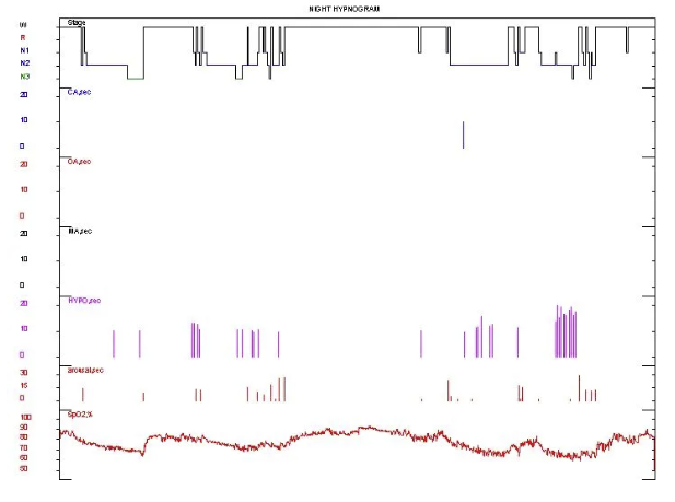 3、睡眠中平均氧饱和度83 %,最低氧饱和度66%。