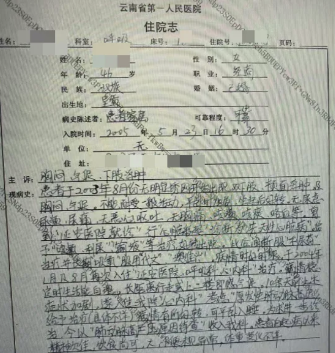 这是一张20多年前的很老旧的病历图。这位女患者于2003年8月无明显诱因出现双下肢、颜面浮肿及胸闷、气促。不能耐受一般活动,平卧时加剧,坐起后好转,无尿急、尿频、尿痛,无恶心呕吐,无胸痛、咳嗽、咳痰、咯血等,曾先后就诊于延安医院心内科及呼吸科院诊断为“先心病”,治疗后好转出院。于2004年两次住院治疗,病情稳定时生活能自理,但长距离行走或上一楼即感气促。入院前10余天症状加剧,入住我院心内科,在心内科住院期间,予强心、利尿、扩血管及氧疗治疗后;患者出现神志恍惚急查血气分析提示血气分析:pH 7.15↓, PO₂ 88mmHg↓, PCO₂ 120mmHg↑。予紧急气管插管治疗后PCO₂ 48mmHg;后患者自行拔管。后转诊于我院呼吸科;以“肺动脉高压原因待查、II型呼吸衰竭”收住。