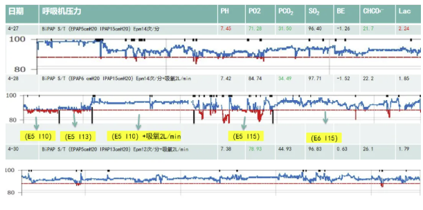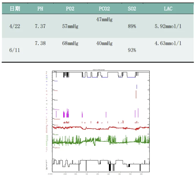 监测结束后血气:PH 7.34↓,PO2 49mmHg ↓,PCO2 57mmHg↑,SO2 83↓ LAC 1.821↑