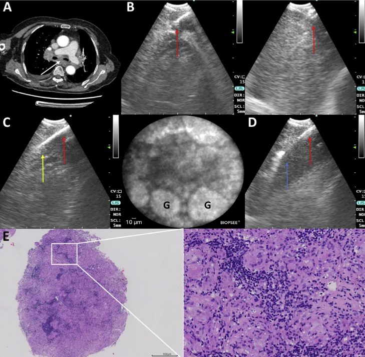 在此次发表的病例报告中,研究团队运用该术式为一例疑似结节病的男性患者实施了nCLE辅助EBUS-TBMC。术中,nCLE实时成像清晰显示多个“比背景细胞更亮、边界清晰、均质”的典型肉芽肿性病变的图像(操作示意图C)。在锁定目标区域后,撤出nCLE探头,在EBUS监测下将冷冻探头沿相同路径置入同一位置(操作示意图D),通过一次5秒的冷冻操作获取组织标本。术后病理结果与nCLE图像特征相符(操作示意图E),患者被明确诊断为结节病,未发生并发症。从建立隧道到完成单块标本获取,整个过程用时3.1分钟。