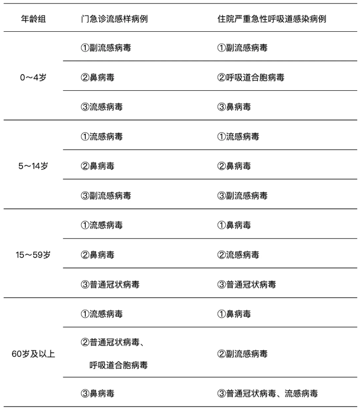 - 住院严重急性呼吸道感染病例呼吸道样本检测阳性率前三位病原体为鼻病毒(7.8%)、副流感病毒(5.8%)、流感病毒(5.5%)。