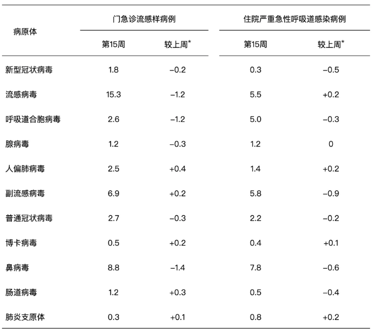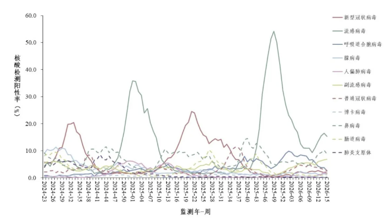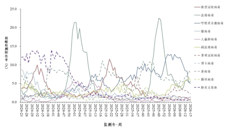 2026年第15周(2026年4月6日—4月12日),对全国哨点医院(不含港澳台)采集的门急诊流感样病例和住院严重急性呼吸道感染病例的呼吸道样本,开展新型冠状病毒、流感病毒、呼吸道合胞病毒、腺病毒、人偏肺病毒、副流感病毒、普通冠状病毒、博卡病毒、鼻病毒和肠道病毒等10种病毒以及肺炎支原体在内的多种呼吸道病原体检测。