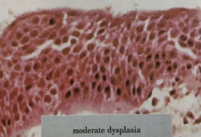 图:中度不典型增生为细胞异型性明显,核分裂象分布在上皮层的下1/3