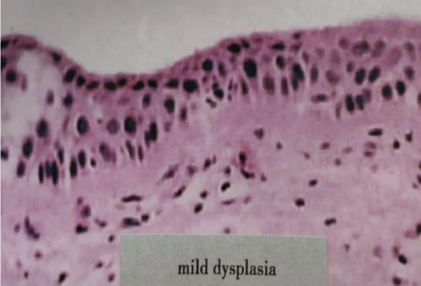 图:轻度不典型增生为组织结构和细胞形态异型性最小,增生的细胞核呈垂直方向,核分裂缺如