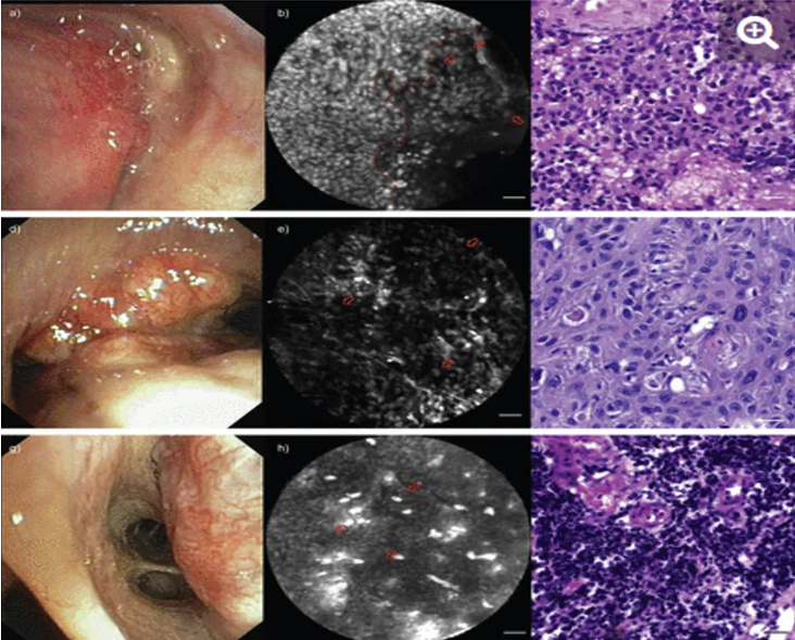 图:从上至下三排分别为:1、肺腺癌:a)中间支气管几乎被外生性病变所遮挡。b)用吖啶黄素局部染色时病变的CLE显示黑暗区域,吖啶黄素摄取很少或没有吸收,提示肿瘤形成。一些肿瘤细胞被突出显示(箭头)。炎性(左)和肿瘤组织(右)之间的边界清晰可见(红色虚线)。c)组织学活检确认存在肿瘤