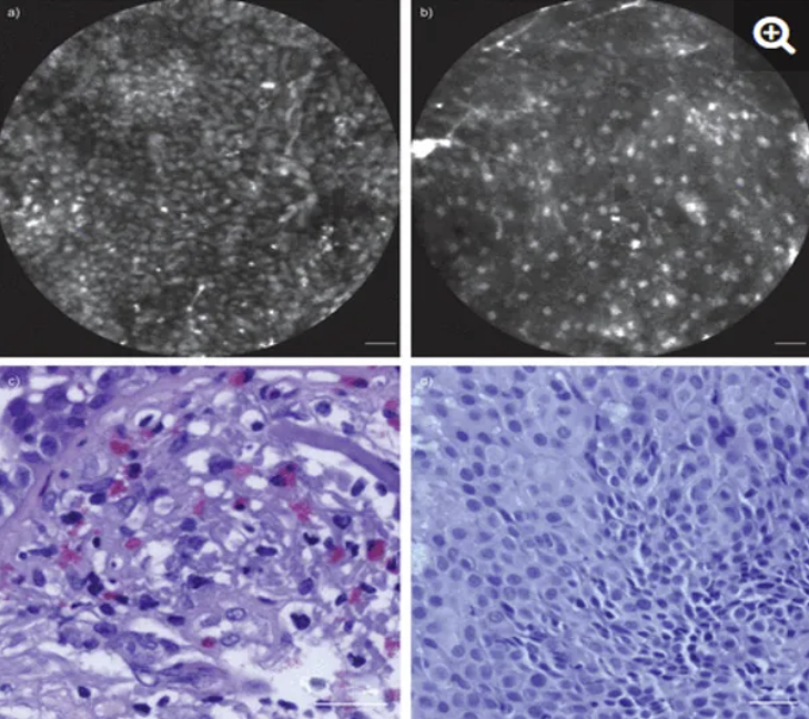 图:通过吖啶黄素辅助共聚焦激光内窥镜检查评估活检的组织学证实a) 中央气道中的炎症和 b)鳞状上皮细胞化生。化生导致细胞核之间的距离增加,很少细胞核重叠,具有增大的细胞质。