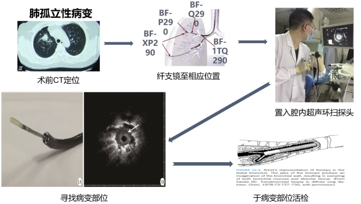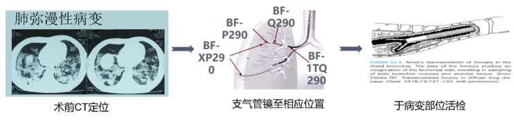肺活检主要包括肺部弥漫性病变及周缘型肺内局灶性病变。下方示意图显示,在CT定位下,对于肺部弥漫性病变,可通过支气管镜引导至病灶部位进行活检,可使用活检钳或冷冻装置。