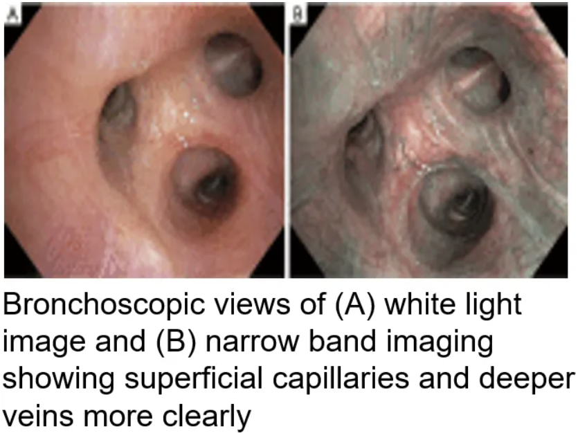 除荧光支气管镜外,窄带成像支气管镜(NBI)是一种新型内镜成像技术,利用光学滤光器产生两种带宽的窄谱光,分别是390~445 nm的蓝色窄谱光和530~550 nm的绿色窄谱光。通过观察这两种窄谱光在黏膜表面和内部的反射情况,可以清晰地显示出不同深度的组织结构,特别是能够增强黏膜的对比度和清晰度,强调黏膜血管形态及表面结构,对于血管发生异常的肿瘤组织具有“电子染色”的作用。