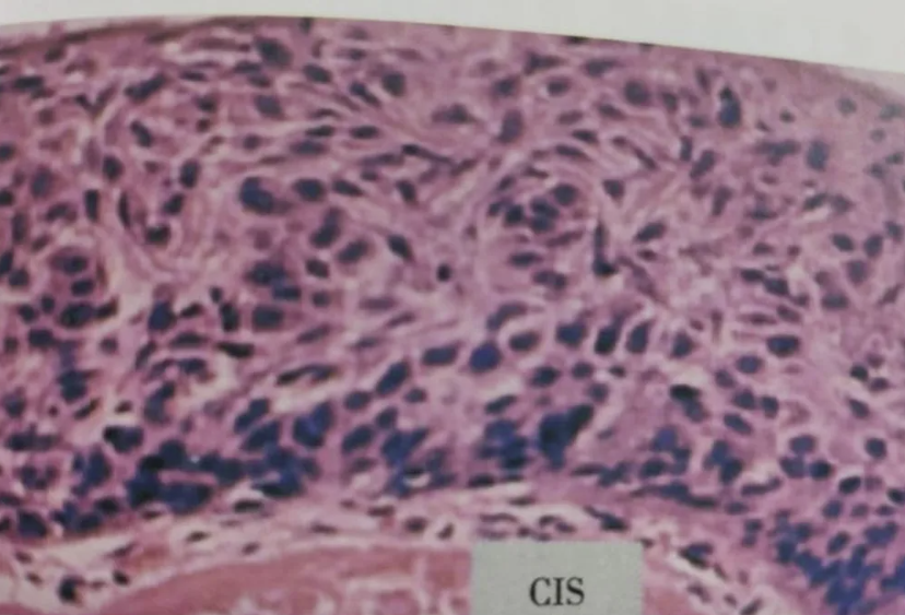 图:原位癌细胞极度异型,核分裂象发生在全层,细胞不成熟,丧失极性