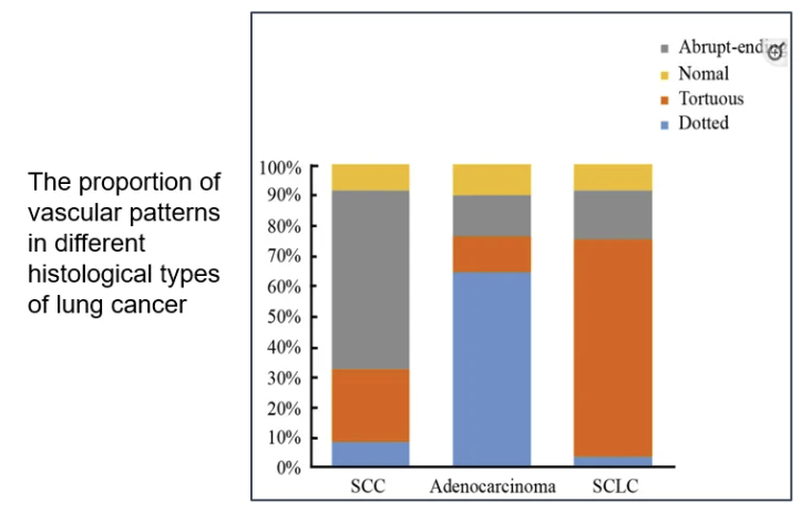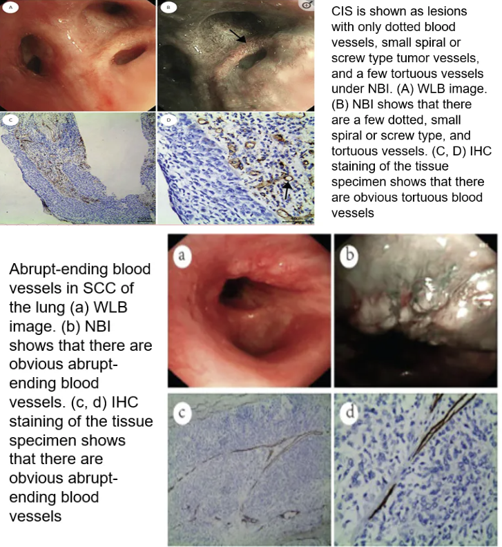 NBI在肺癌早期诊断中,主要观察四种血管纹理变化:1、血管纹理增粗,走形紊乱;2、斑点改变;3、两者兼有;4、未见明显异常。绝大多数的中央型肺癌均可有肿瘤黏膜表面血管异常,而这种特点在WLB及AFB下并不能轻易发现,此特点为NBI所独有的功能。[4]