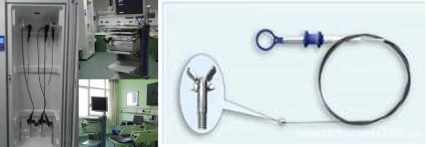 图:电子支气管内窥镜(左)、活检钳(右)