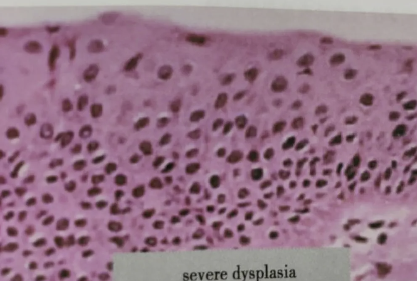 图:重度不典型增生为细胞异型性更明显,细胞呈多形性。在上皮全层的下2/3处出现核分裂象,棘细胞层几乎消失
