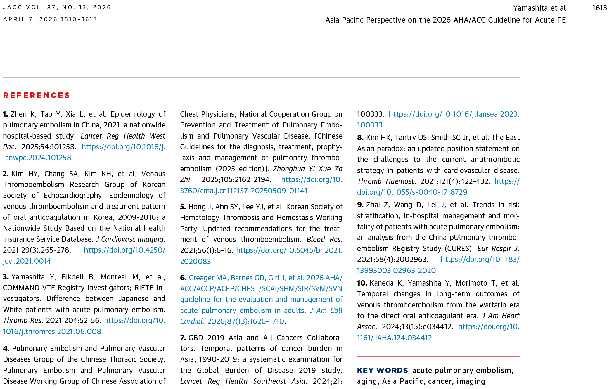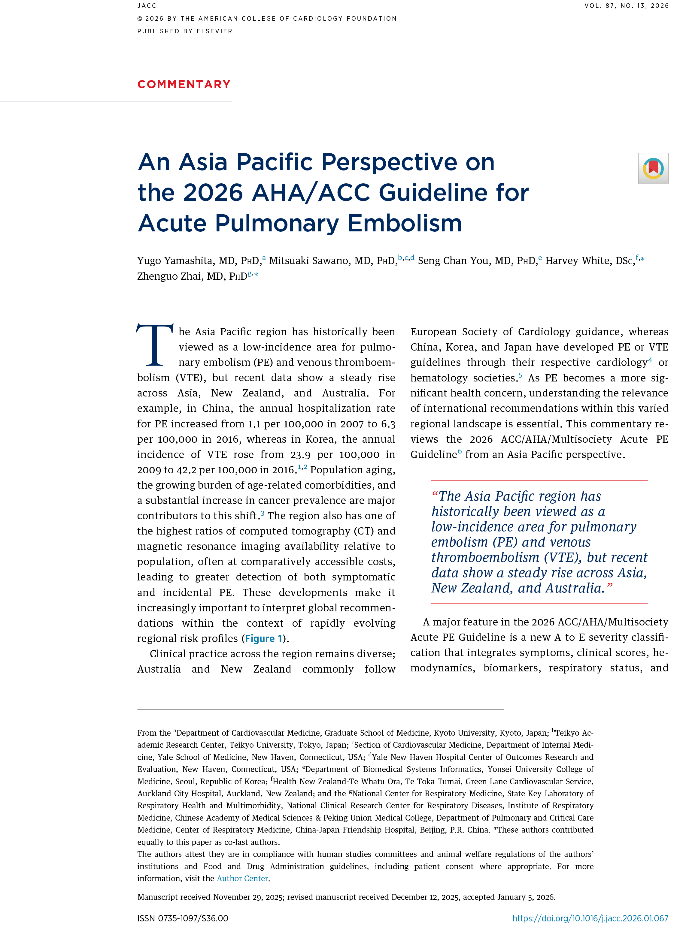 翟振国教授联合亚太专家在美国心脏病学杂志(JACC)发表特邀评论,从亚太和中国视角解析北美最新肺栓塞指南