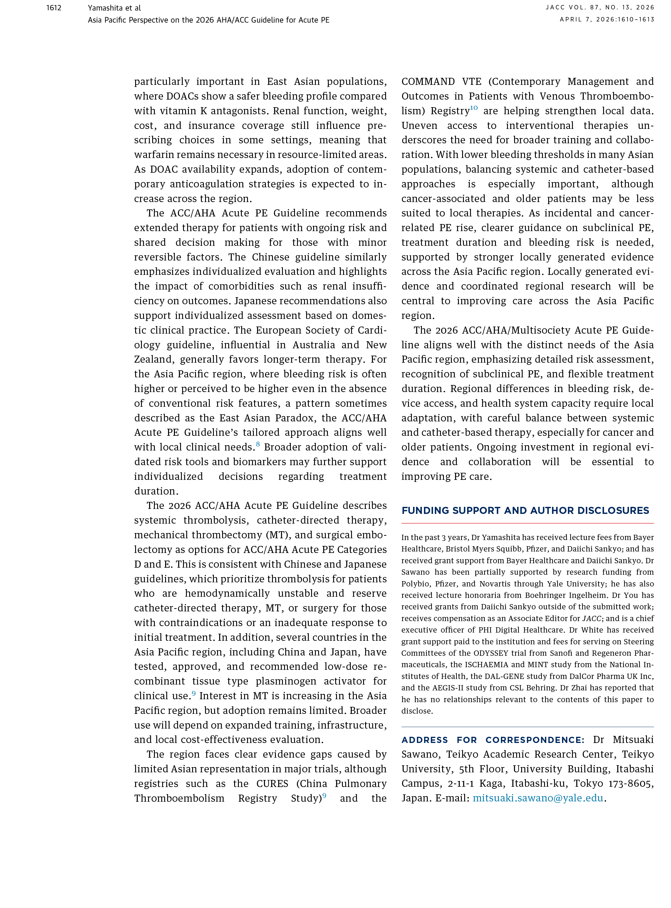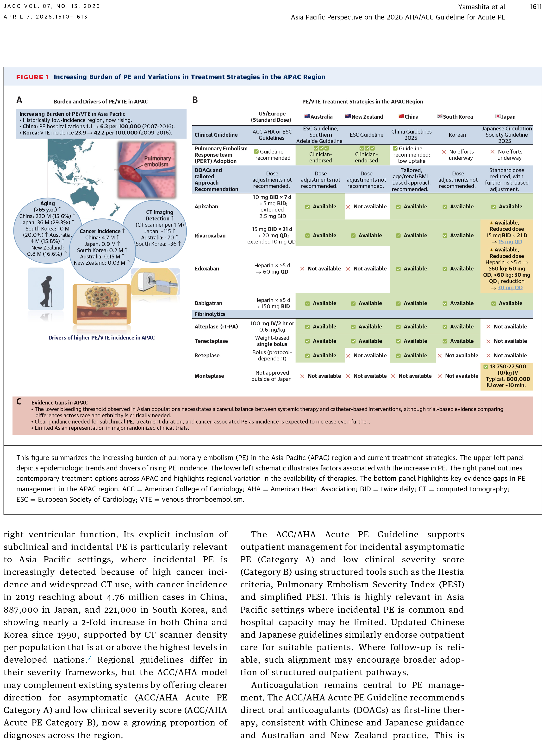 亚太地区的临床实践仍呈现多样性;澳大利亚和新西兰通常遵循欧洲心脏病学会的指南,而中国、韩国和日本则通过各自的心脏学会或血液学会制定肺栓塞或静脉血栓栓塞症指南。随着肺栓塞成为一个日益严峻的健康照护问题,在亚太这一多样化的区域背景下理解国际建议的相关性至关重要。本评论从亚太视角审视《2026年ACC/AHA/多学会急性肺栓塞指南》。