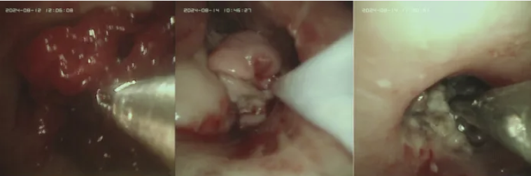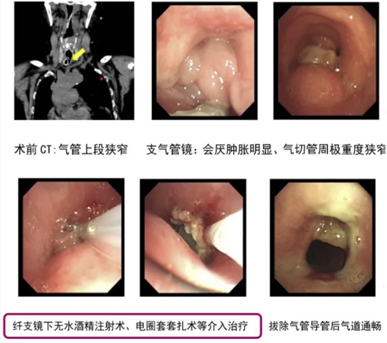 病例3:69岁女性患者,脑出血术后并发吸入性肺炎,经气管切开抢救后,因喉头重度水肿、气道上段及切开处管周极重度狭窄并大量肉芽生长,多次封管失败。经笔者团队专业评估后,采用支气管镜下无水酒精注射术、电圈套套扎术等介入治疗(图5),清除肉芽组织、缓解狭窄,最终成功封管拔管,患者好转出院并回归家庭和社会。