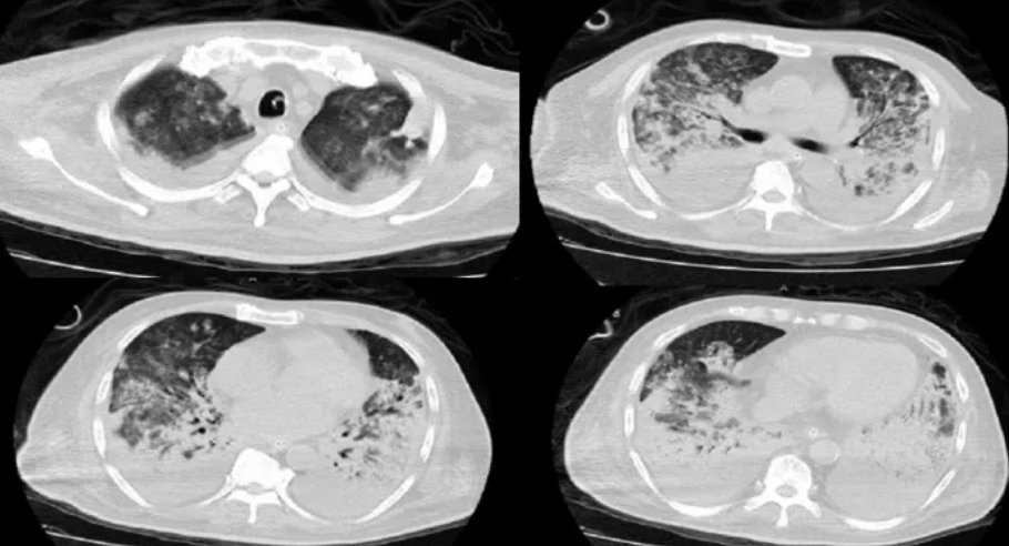 病例1:65岁男性患者,因“发热伴咳嗽、咳痰、气促5天,加重10小时”入院。诊断为危重症人感染H7N9禽流感并发重症肺炎、重度ARDS、急性肾衰竭及多器官功能障碍综合征,同时合并2型糖尿病及高血压3级。在呼吸机高度参数支持下行FBPDT,快速建立气道通路,为后续治疗赢得时间,患者经积极治疗后康复。患者入院胸部CT见图1,治疗前后胸片对比见图2。