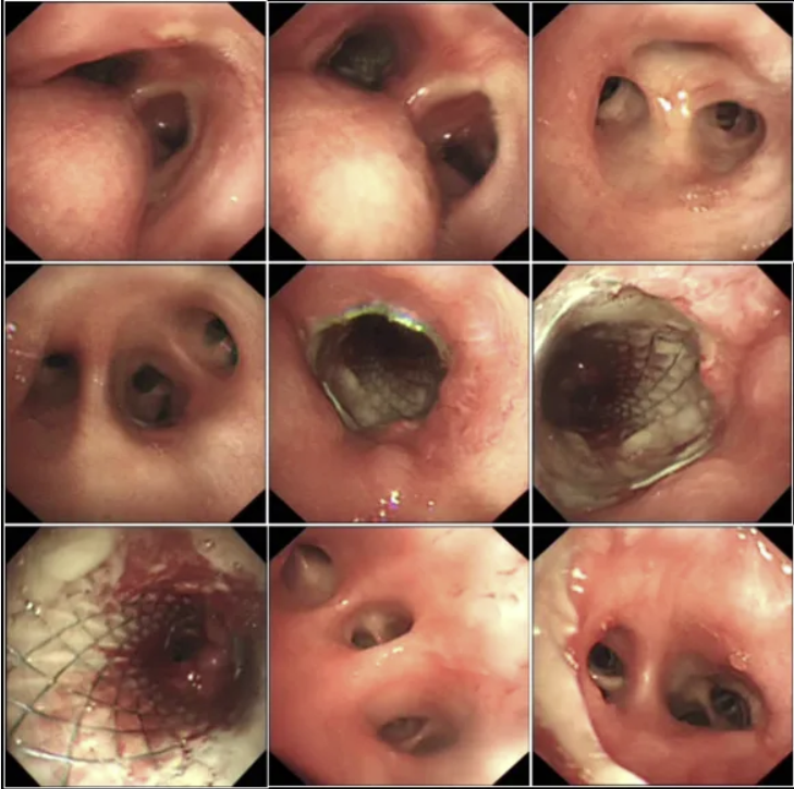 病例9:55岁男性患者,因“肺癌术后反复发热、咳嗽、咳痰伴呼吸困难1个月,加重3天”于2022年1月由某大型肿瘤医院转入。患者1个月前因肺鳞癌行右肺全切除术,术后出现右支气管残端胸腔瘘(图17),并发右侧脓胸、呼吸衰竭、脓毒性休克及重度低蛋白血症。支气管镜检查明确瘘口位置后,采用覆膜金属支架(封堵用L型)进行腔内封堵(图18),同时加强抗感染、营养支持及休克纠正,患者肺部感染逐渐控制,呼吸功能改善,最终好转出院,定期门诊随访。