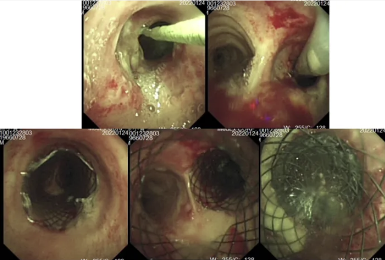 经支气管镜综合介入治疗是解除中心气道阻塞的关键,包括CO2冷冻、APC、球囊扩张、电圈套套扎、支架置入、镜下注药等技术。其中,支气管镜直视下金属支架置入术是最简单有效的方法,可快速建立通畅气道,维持患者生命体征稳定,为后续抗肿瘤治疗创造条件。待患者病情平稳后,可转至呼吸介入中心或手术室进行腔内病变的后续处理。