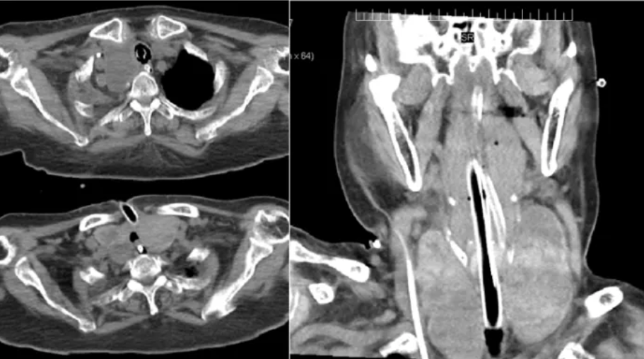 病例2:78岁女性患者,因“进行性呼吸困难10年,加重1天”入院。诊断为气道重度狭窄(胸骨后巨大甲状腺肿压迫导致)(图3)、Ⅱ型呼吸衰竭、低通气综合征;同时合并2型糖尿病及高血压3级。因患者年龄大、手术风险高,选择FBPDT建立气道(图4),短期有效缓解了气道梗阻,保障了生命体征稳定。
