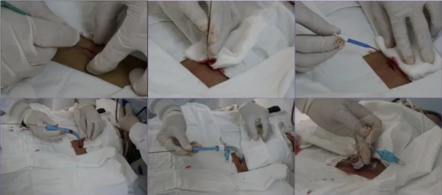 (1)操作准备与要点:术前需完善知情同意、禁食、备皮等准备工作,常规检查血常规、凝血功能、输血前八项等指标。操作需在呼吸RICU床旁进行,由2名医生和1~2名护士协作完成,主要器械包括一次性气管切开导入器和纤支镜。穿刺点选择2~3软骨环之间。纤支镜可实时确定穿刺位置和深度,同时及时清除分泌物,避免误穿和窒息风险。
