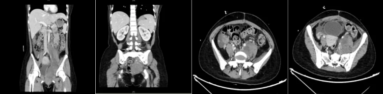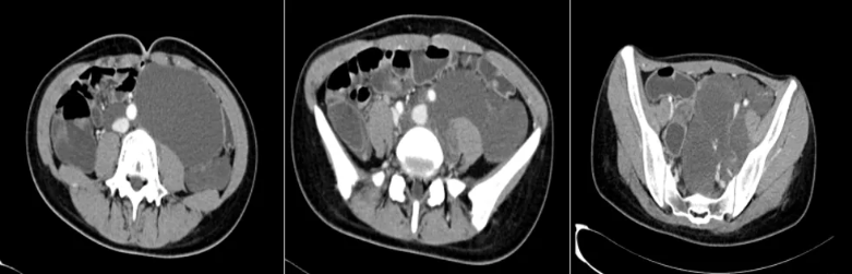 患者于2026年1月3日排便后出现下腹痛,伴发热、畏寒、寒战,体温最高达40℃,伴全身肌肉酸痛乏力。外院查血常规提示白细胞计数降低(3.78×10⁹/L)、中性粒细胞比例显著升高(94%),降钙素原(PCT)35.211ng/ml显著升高。腹部CT提示腹膜后及盆腔多发囊性占位(考虑脉管源性肿瘤)。