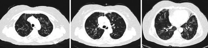 查体:口唇发绀,无杵状指,双肺可闻及湿啰音。心脏无明显异常,双下肢无明显水肿。入院后查血气分析(FiO2:21%):pH 7.47,PaO2 45 mmHg(1 mmHg=0.133 kPa),PaCO2 40 mmHg,SO2 84%。血常规:白细胞计数10.011×109/L,嗜酸性粒细胞计数0.00×109/L,淋巴细胞计数0.97×109/L,淋巴细胞计数百分比9.7%。糖类抗原19-9:38.4 U/nL;糖类抗原72-4:7.75 U/mL;细胞角蛋白19片段:3.39 ng/nL。免疫球蛋白、类风湿因子、高敏肌钙蛋白T、血管紧张素转化酶等检查结果未见明显异常。淋巴细胞亚群绝对计数检测:淋巴细胞百分比5.59 %,B细胞百分比6.3 %,淋巴细胞计数604个/μL,总T细胞计数433个/μL,辅助/诱导细胞计数258个/μL,抑制性/细胞毒细胞计数164个/μL,B细胞计数38个/μL,NK细胞计数129个/μL,NKT细胞计数11个/μL。抗U1-小核糖核蛋白抗体(A-U1-snRNP)弱阳性,抗史密斯D1抗体(SmD1)弱阳性,抗组蛋白抗体(AHA)弱阳性。抗核抗体(ANA)均质型,1∶320。抗磷脂综合征、抗中性粒细胞胞浆抗体组套阴性,总IgE等检查结果未见明显异常。肺功能提示小气道功能障碍(操作过程中频繁咳嗽可能影响检查结果),肺一氧化碳弥散量60%~79.9%预计值,轻度弥散功能障碍。追溯病史,患者2016年曾行PET/CT检查,调取影像CT发现,肺部间质性改变(图3)。考虑胸腺瘤相关自身免疫所致间质性肺病,加用激素40 mg 3天后患者症状明显好转出院。