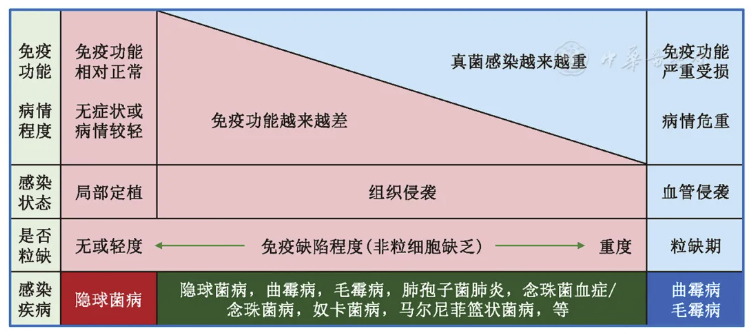 粒缺与非粒缺患者罹患IFD危险因素之间的差异与两者间免疫功能状态被影响的程度密切相关。粒缺属于典型的急性重度免疫缺陷,容易罹患IFD且病情危重,通常易于识别;但非粒缺患者的基础疾病多样,免疫受损程度差异极大,可以从基本正常(见于单纯肺隐球菌病患者)到严重缺陷(类似于严重粒缺),尤其轻到中度免疫受损的范围极广、变异度大,从而导致它们在危险因素、临床特征和实验室检查、罹患IFD的病种之间存在明显差异[15,21](图1),就需要更为细致、综合评估的思维方式。