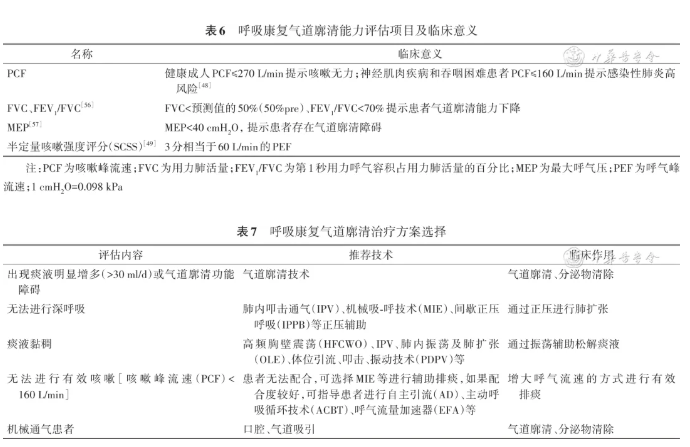 呼吸康复气道廓清能力评估见 表6 ,呼吸康复气道廓清治疗方案选择见 表7 。