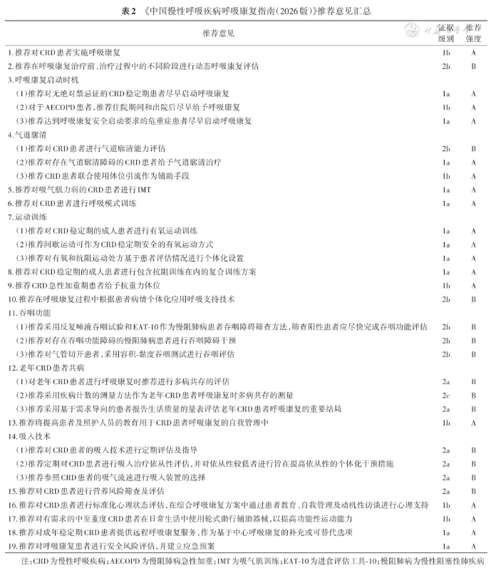 慢性呼吸疾病(CRD)是造成非传染性疾病负担的重要因素。CRD是2017年全球第3大死亡原因,占所有死亡人数的7.0%,仅次于心血管疾病和肿瘤 [ 1 ] 。常见的CRD包括支气管哮喘、慢性阻塞性肺疾病(简称慢阻肺病)、间质性肺疾病(ILD)、支气管肺癌、囊性纤维化、职业性肺病和肺动脉高压(PH)。2020年,40岁及以上成年人口的慢阻肺病患病率估计为10.6%,影响超4亿人,造成巨大的疾病负担 [ 2 ] 。针对以慢阻肺病为代表的CRD,应当以“语药械食居环”为手段,构建“促防诊控治康”六位一体的健康照护体系,实现从“以治病为中心”向“以人民健康照护为中心”转换 [ 3 ] 。大量的循证医学证据证实呼吸康复能够改善CRD患者的呼吸困难症状,提高运动耐力和健康相关的生活质量,是最具成本效益的治疗策略之一。为了更好地指导CRD 呼吸康复临床实践,中华医学会呼吸病学分会呼吸康复学组(筹)、中国康复医学会呼吸康复专业委员会和中国医师协会呼吸医师分会共同组织国内呼吸与危重症医学、康复医学、循证医学、全科医学、护理学、老年医学、中医学、营养学、心理学等领域的专家,系统评价了国内外近年来发表的CRD 呼吸康复领域相关指南和循证医学研究证据,在《中国慢性呼吸道疾病呼吸康复管理指南(2021年)》 [ 4 ] 的基础上修订了《中国慢性呼吸疾病呼吸康复指南(2026版)》。